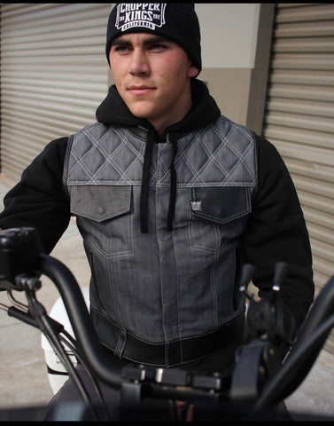 Raw Denim 14 oz, with leather details, zip and buttons, double stitching, 1 inch collar, american flag lining, zipped side pockets, internal right pocket, internal left gun pocket, stash pocket on the internal waist, 4 inches shorter than the OG vest.